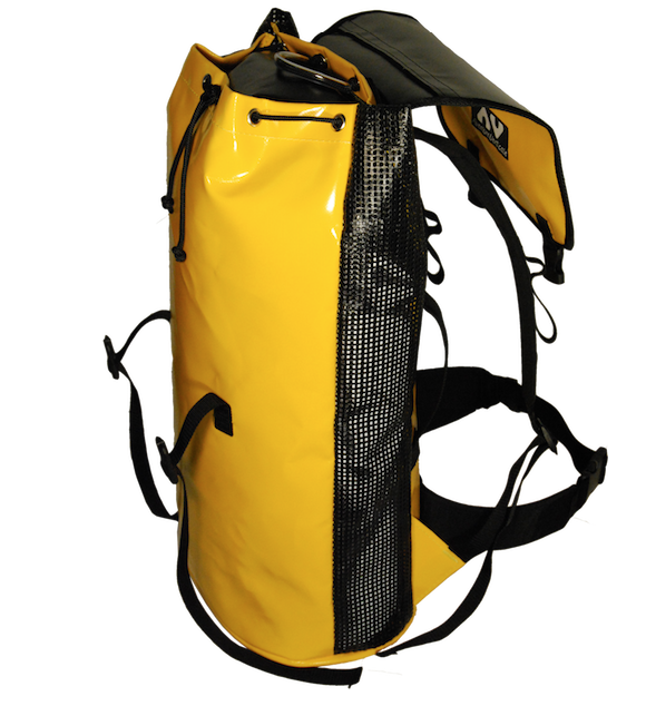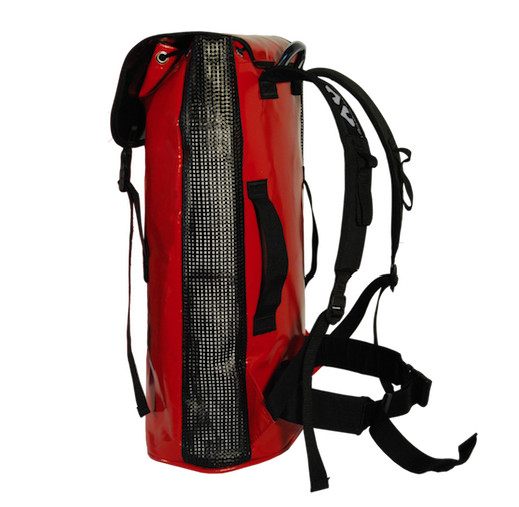 Sac pour le canyoning en bâche PVC 1100 dTex 900 g/m² laqué, avec évacuation d'eau par deux grandes grilles latérales.