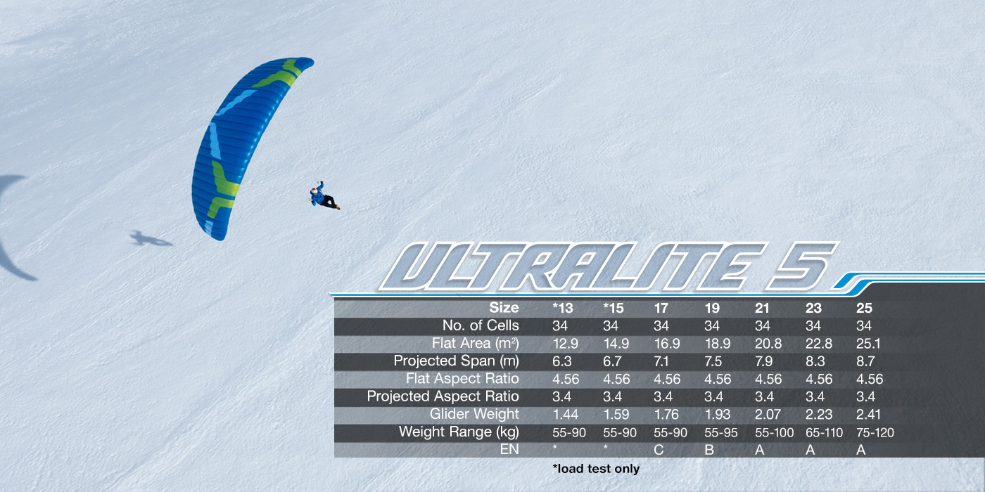 Le top de l’aile de vol ultra-légère revient… plus légère et plus performante que jamais. La toute nouvelle Ultralite5 apporte un gain 0,8 point de finesse et 7 km/h de vitesse tout en étant 100g plus légère que la version 4. Avec 2 nouvelles tailles supplémentaires, elle est disponible de 13m² à 25m² pour satisfaire tous les pilotes, quelle que soit la façon de monter… et de descendre.